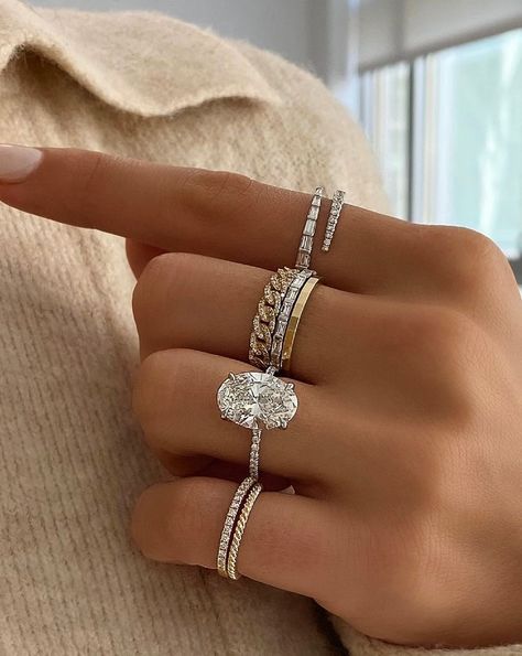 Experiment with different metals and textures by stacking multiple rings on one finger or across several fingers. A mix of thin bands with gemstones or plain bands in contrasting colors like yellow and white gold can add depth and interest